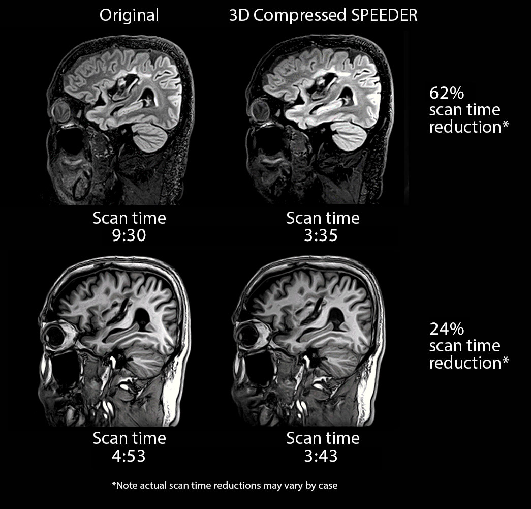 Compressed SPEEDER is a new imaging technique that accelerates scan times in both 2D and 3D acquisitions without loss of quality.