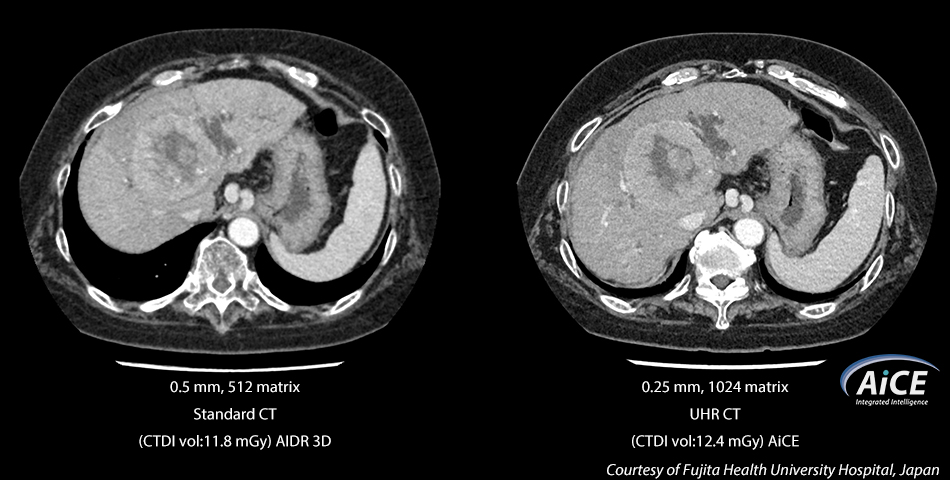 Known as AiCE, this deep learning reconstruction network is trained on an advanced Model-Based Iterative Reconstruction (MBIR) algorithm to produce low noise, and 0.25 mm, 1024 matrix Ultra-High Resolution CT images.