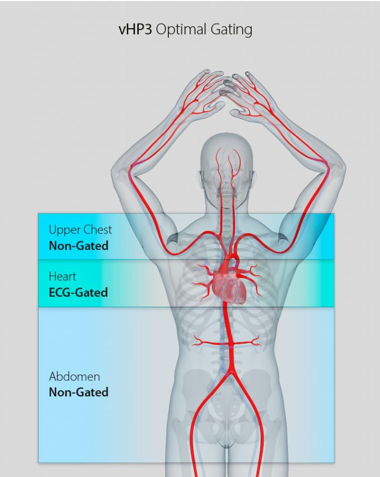 vHP 3-Phase* allows three scans to be performed in a single acquisition, seamlessly transitioning between scan parameters optimized for each body region. vHP 3-Phase has potential for less contrast media and lower radiation dose by providing the flexibility to seamlessly transition.